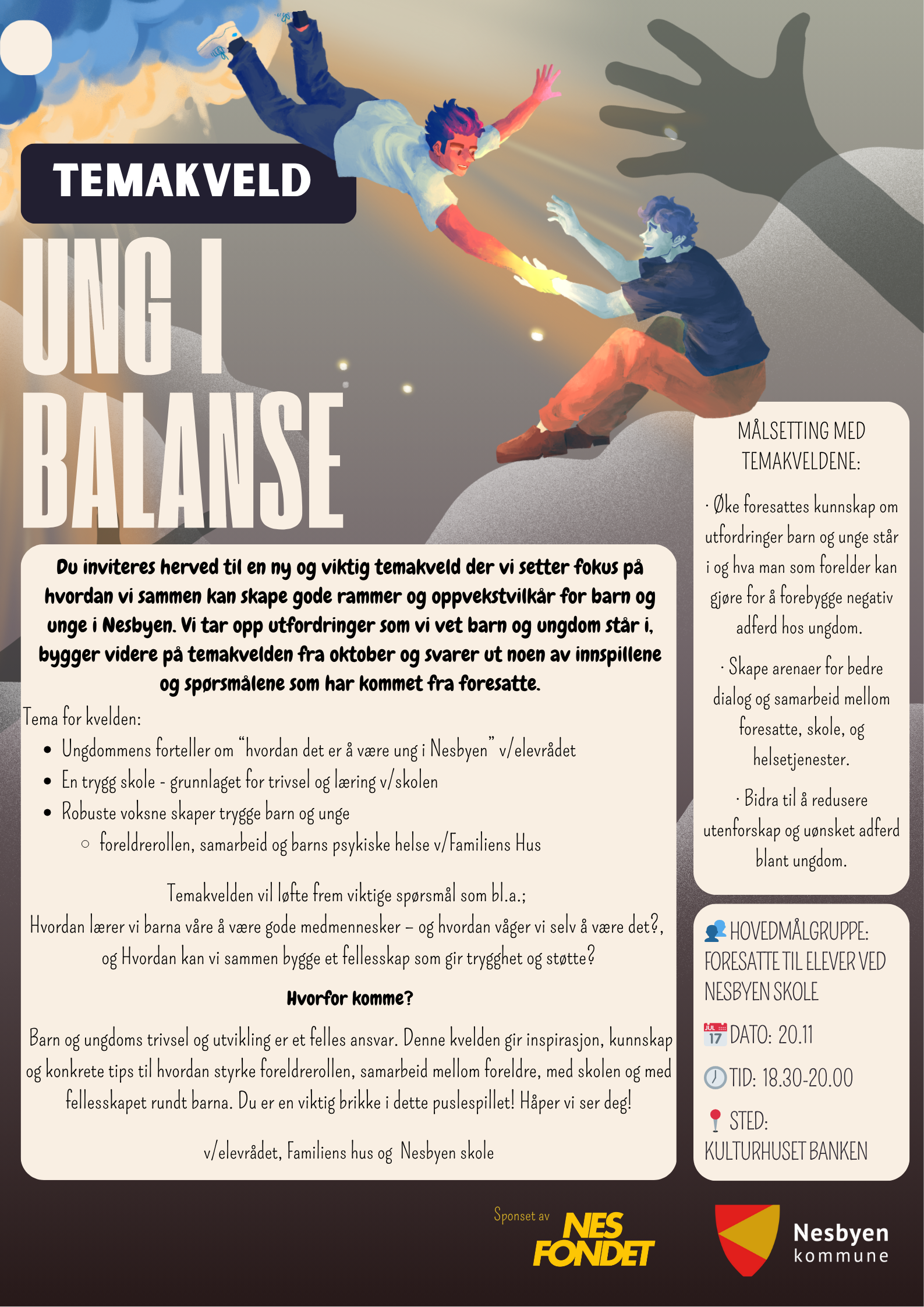 Nesbyen kommune inviterer spesielt foresatte til elever ved Nesbyen skole til Temakvelden UNG I BALANSE, 20.11. kl. 1830-2000 i Kulturhuset Banken.